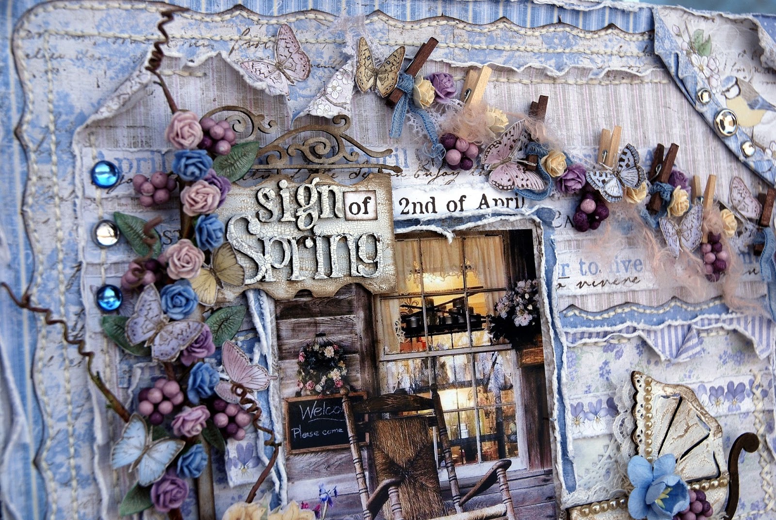 I made this little cloths line,because in the spring time I always see cloths,or blankets airing out on cloths lines. I first attached the cloths pins to lace,then tied on ribbon,added blooms then cut out butterflies from 6th of May.I folded the top right hand corner,so that you could see the bird perched on the branch(1st of April),I secured the folds with brads.....