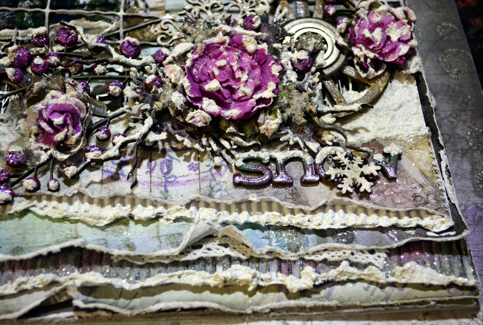 The plum flowers are prima & the green flowers under are DA,I glued the 2 together to make them look like the cabbages,then applied white sand texture ....I used white crackle on the snow flakes....