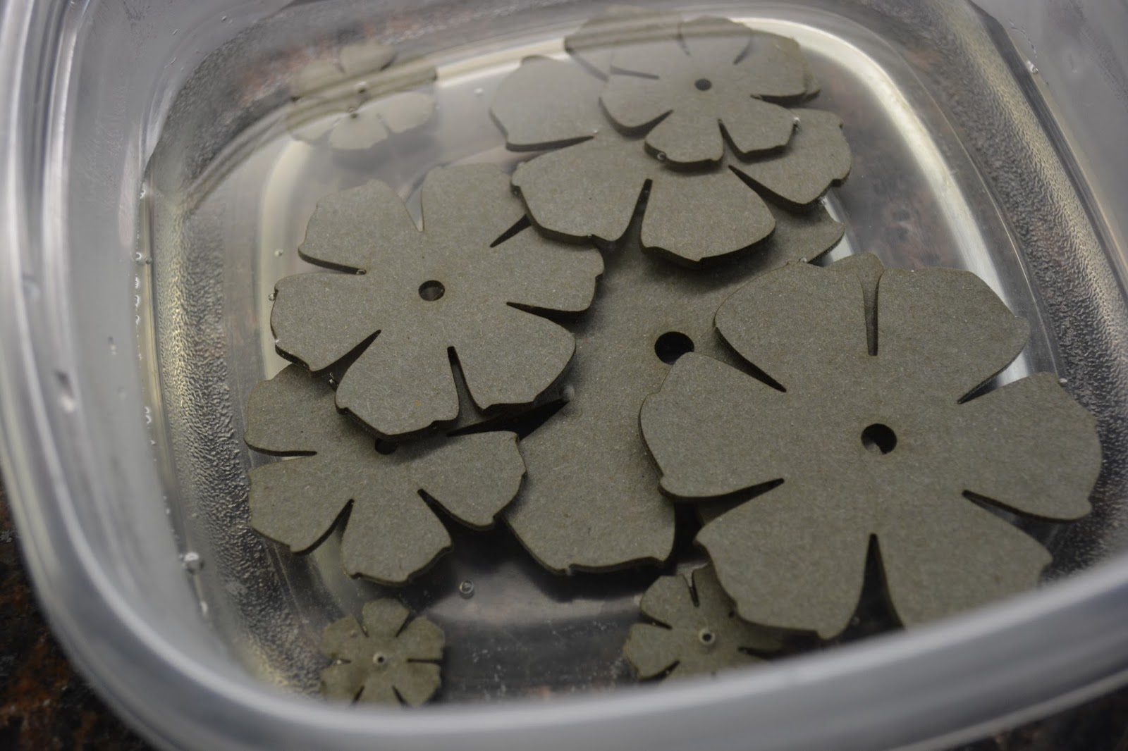 My first step was to soak the flowers in warm water, separate the chipboard layers,then I crumpled them up.