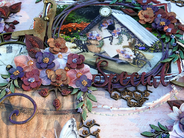 The Bird House is embellished with cut outs from the Heirloom Cut Out Sheet, 49 and Market Basic Roses, Lavender, Prills, Dusty Attic Chipboard, Prima Metal Clock & Prima Bling...