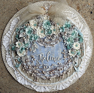 Other elements used: Prima Clear Gesso, Prima snow texture paste, Prima glass glitter-pearl, clear crackle, LuminArt H20-Heavenly White, Shimmerz, Inklings-Chocolate & Diamonds, Nuvo Crystal Drops-Antique Rose, Liquid Pearls Robins Egg,Dreamweaver Translucent embossing paste, burlap string, lace, ribbon,old doily, pine cones, place mats