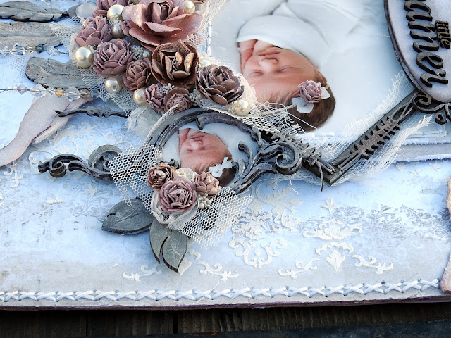Other Elements used: Prima Roses-Solid Rose, Little Birdie mini roses, Prima Rosette Trim, The Crafters Workshop-mini Damask, Prima say it in crystals, Prima Pearls,Prills-Mini Pearls, LuminArt Oyster, Versa Mark-Pinecone