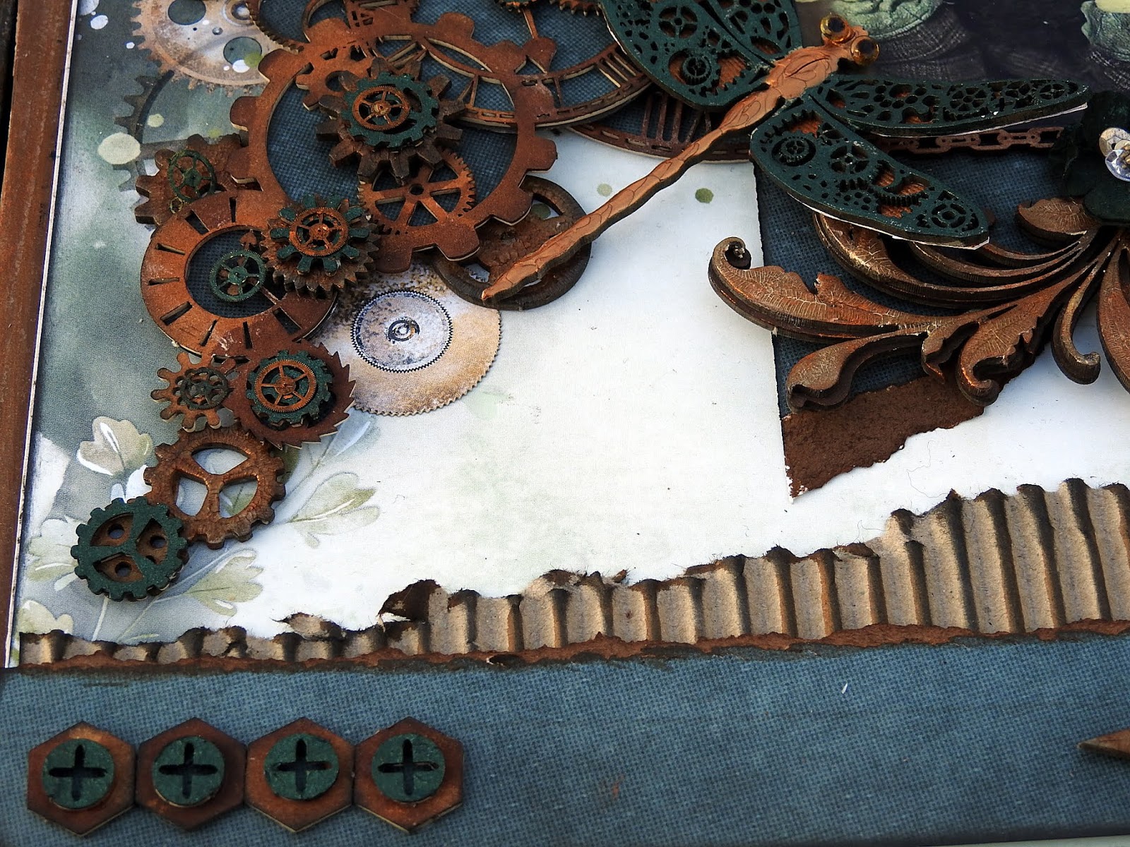 Other Elements used:Dusty Attic Chipboard,Clear Gesso, Clear Crackle Paint, Tim Holtz Distress Stain-Vintage Photo, LuminArt Silk-Black Emerald, Prima Wax-Vintage Sik, Black Ink Pad, Sequins, Corrugated Card,Tiny Metal Cogs,Prills....Here are a few close ups....