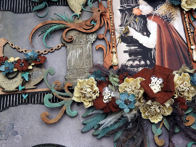 Other Elements used: Clear Gesso, Clear Crackle Paint, Prima Wax-Firebird, Vintage Silk, Peacock, Blue Lagoon, Chalk, Black Ink Pad, Silk Died Ribbon, Liquid Pearls, Sequins, Beads, Black Corrugated Paper, TH Alcohol Ink Rust....Here are a few close ups.....